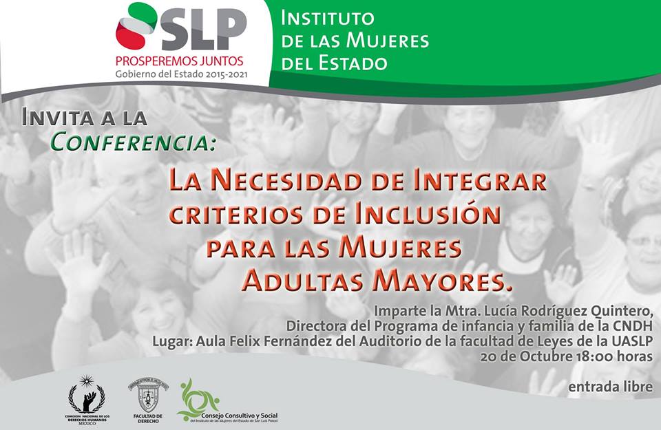 El Instituto de las Mujeres del Estado de San Luis Potosí (IMES), el Consejo Consultivo y Social del IMES en colaboración con la Facultad de Leyes de la UASLP y la Comisión Nacional de Derechos Humanos te invita a la conferencia: "La Necesidad de Integrar Criterios de Inclusión para las Mujeres Adultas Mayores". Imparte: Mtra. Lucía Rodríguez Quintero, Directora del Programa de Infancia y Familia de la CNDH.