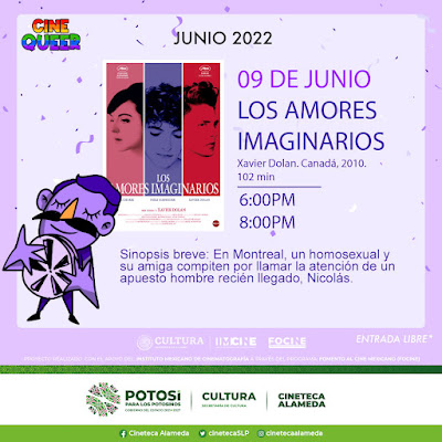 “Los amores imaginarios” (2010) del director Xavier Dolan estará el jueves 09 de junio en un horario de 6:00 y 8:00 pm, el cual habla de un homosexual y su amiga quienes compiten por llamar la atención de un apuesto hombre llamado Nicolás, recién llegado a Montreal.